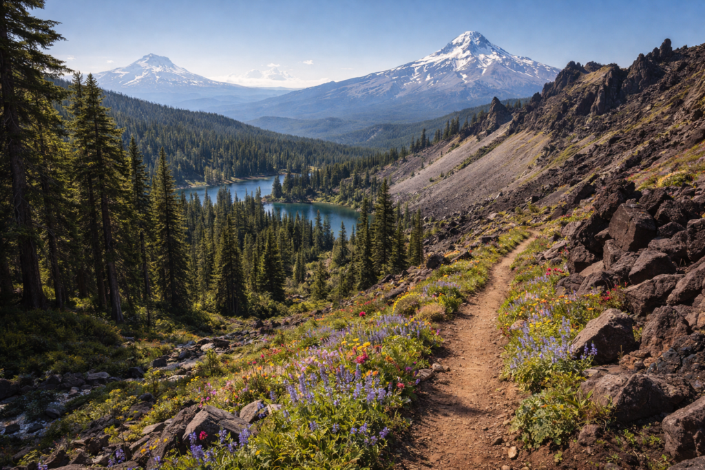 Her går man gjennom store skoger, gamle lavafelt og forbi vakre innsjøer. Et av høydepunktene er Crater Lake, en dyp blå innsjø dannet i et gammelt vulkankrater.